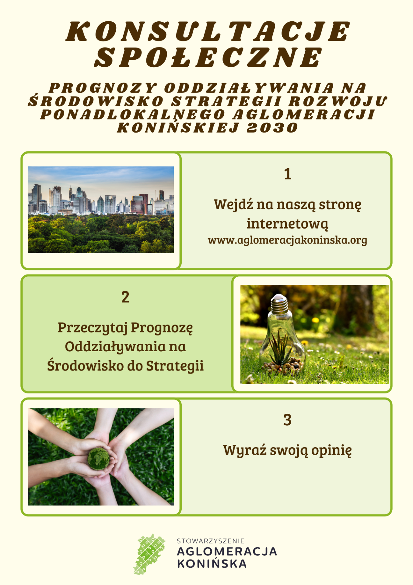 - możliwości zapoznania się z projektami ww. dokumentów oraz stanowiskiem Regionalnego Dyrektora Ochrony Środowiska w Poznaniu (znak: WPP-III.411.260.2025.ET.1 z dnia 13.01.2026 r.) oraz Wielkopolskiego Państwowego Wojewódzkiego Inspektora Sanitarnego (znak: DN-NS.9011.807.2025 z dnia 16 stycznia 2026 r.) w sprawie uzgodnienia zakresu i stopnia szczegółowości informacji wymaganych w prognozie oddziaływania na środowisko dla projektu aktualizacji „Strategii Rozwoju Ponadlokalnego Aglomeracji Konińskiej 2030”,